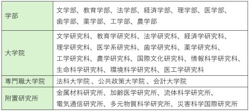 • 東北大学大学院 :医学系研究科、歯学研究科、薬学研究科、工学研究科、情報科学研究科、生命科学研究科、 医工学研究科、加齢医学研究所、多元物質科学研究所